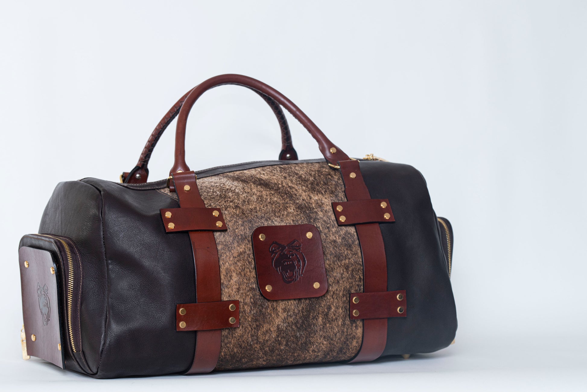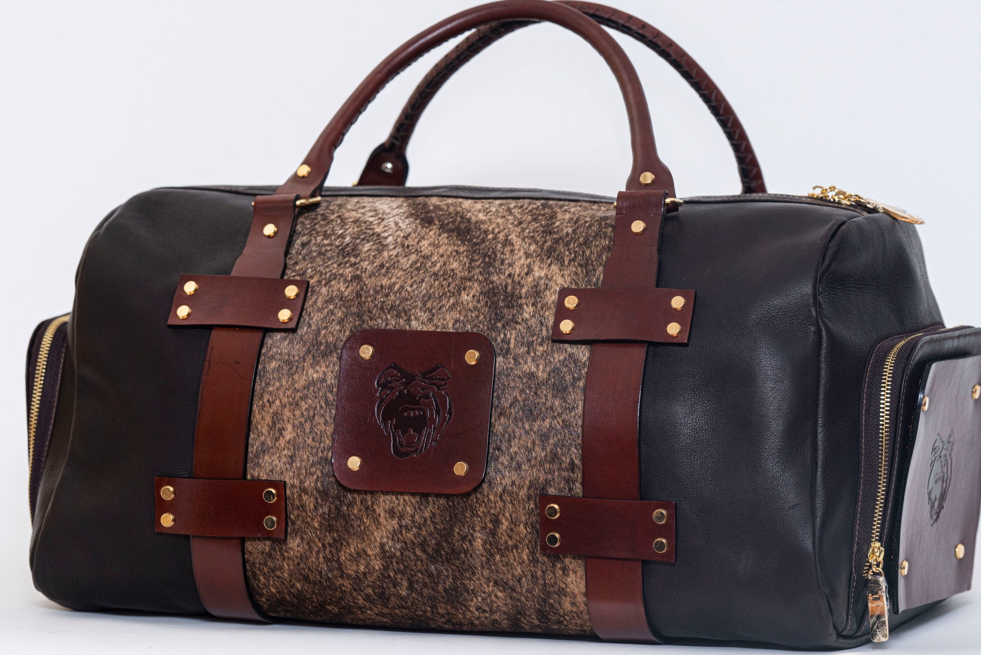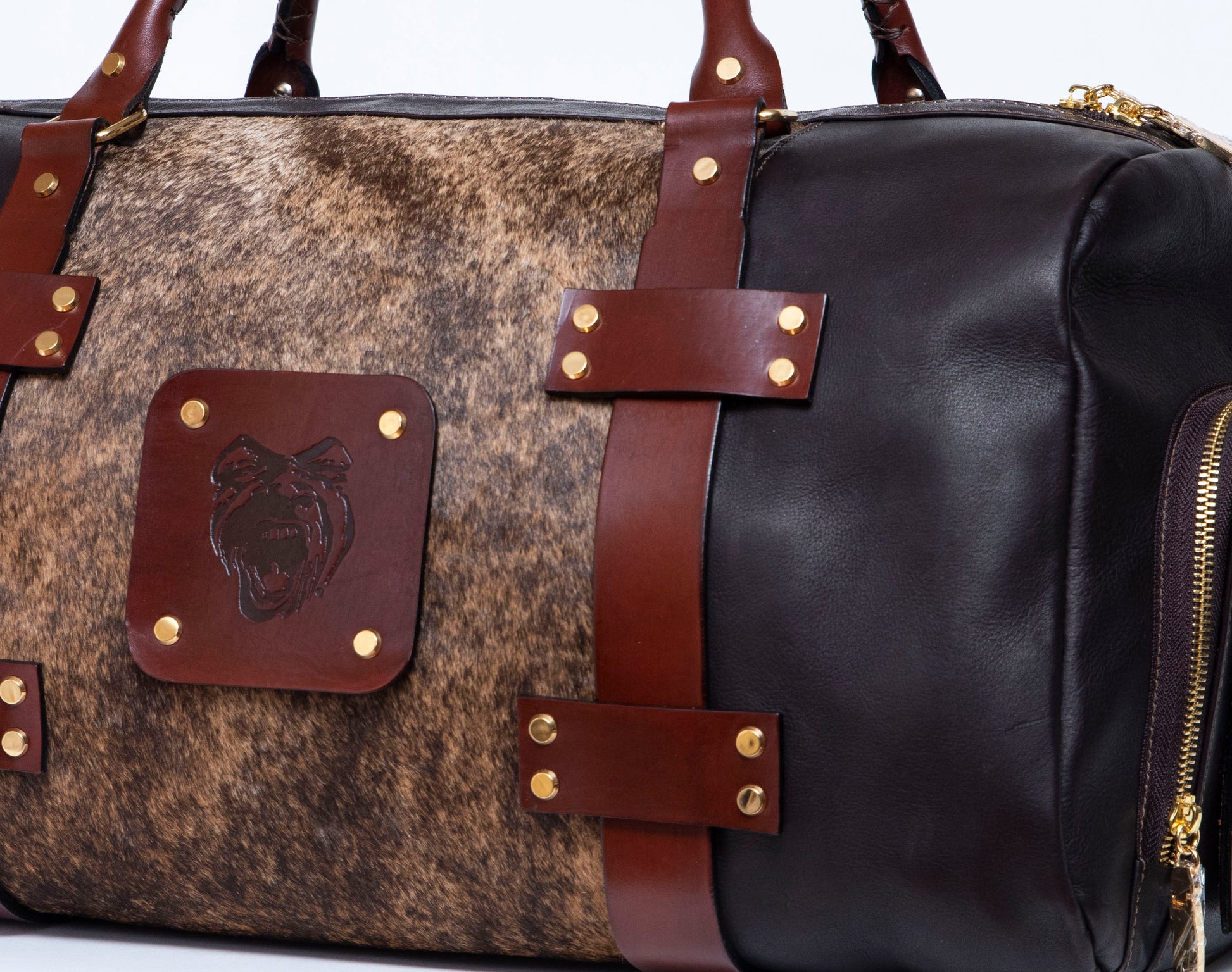The Lake Shore Duffle is built for movement with presence. Featuring a textured cowhide body framed by smooth leather panels and reinforced with contrast straps, this bag delivers durability with a raw edge. Gold hardware and the signature Rage face emblem complete the look. Made to haul gear without losing style.